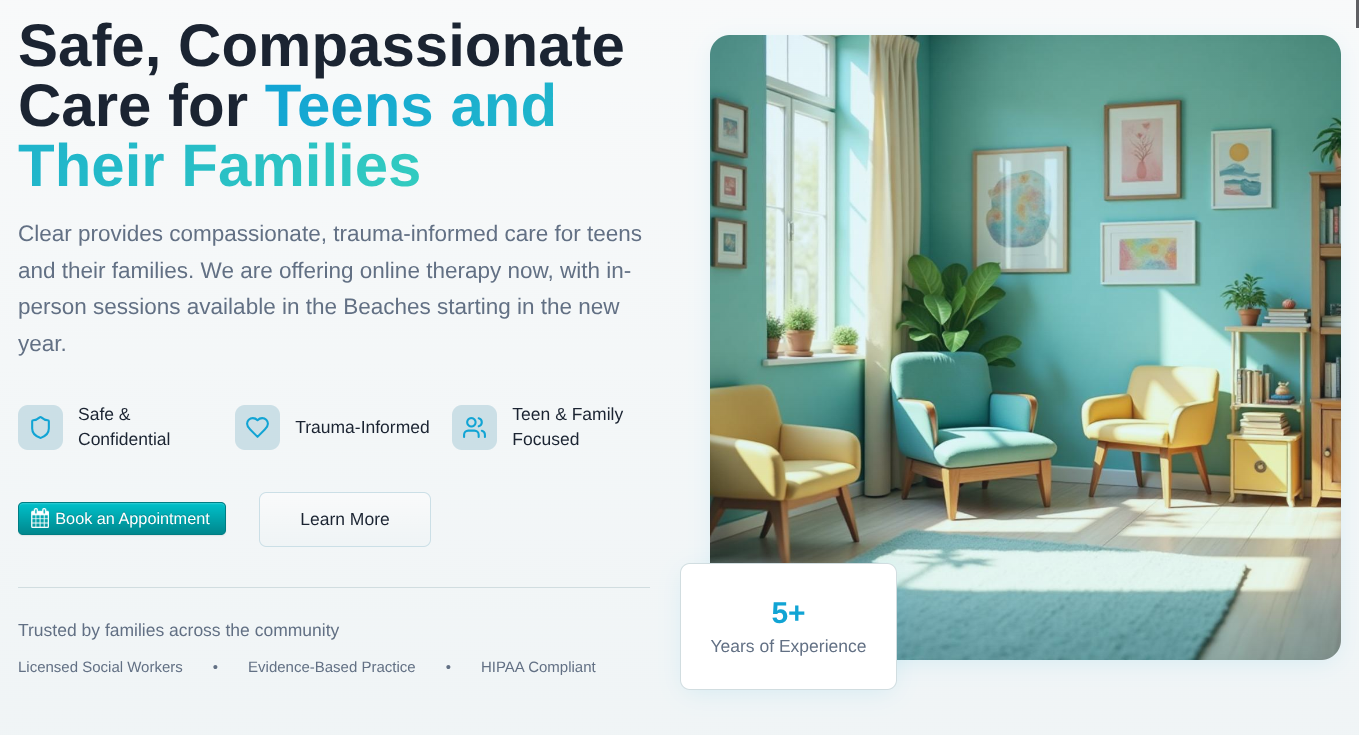Safe, Compassionate Care for Teens and Their Families. Clear provides compassionate, trauma-informed care for teens and their families. We are offering online therapy now, with in-person sessions available in the Beaches starting in the new year.