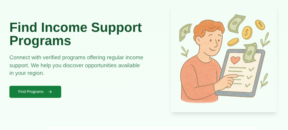UBI Finder is an educational platform that demystifies Universal Basic Income and connects people with available UBI programs. Our comprehensive database and matching system helps users discover and apply for UBI pilots, trials, and programs they're eligible for, advancing the movement toward economic security for all.